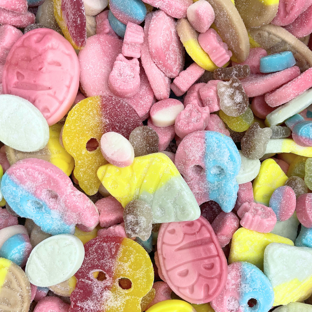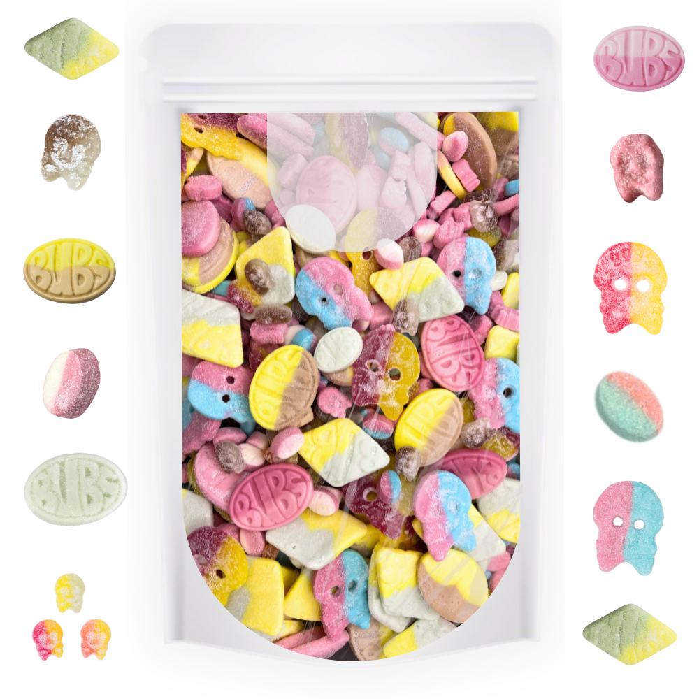 Mix contents will vary between bags, but may include the following: Pomegranate Bubs, Banana Bubs, Giant Sour Skulls, Dizzy Skulls, Sour Foam Rhombs Tutti Frutti, Mini Pear Ovals, and an assortment of Mini Bubs!