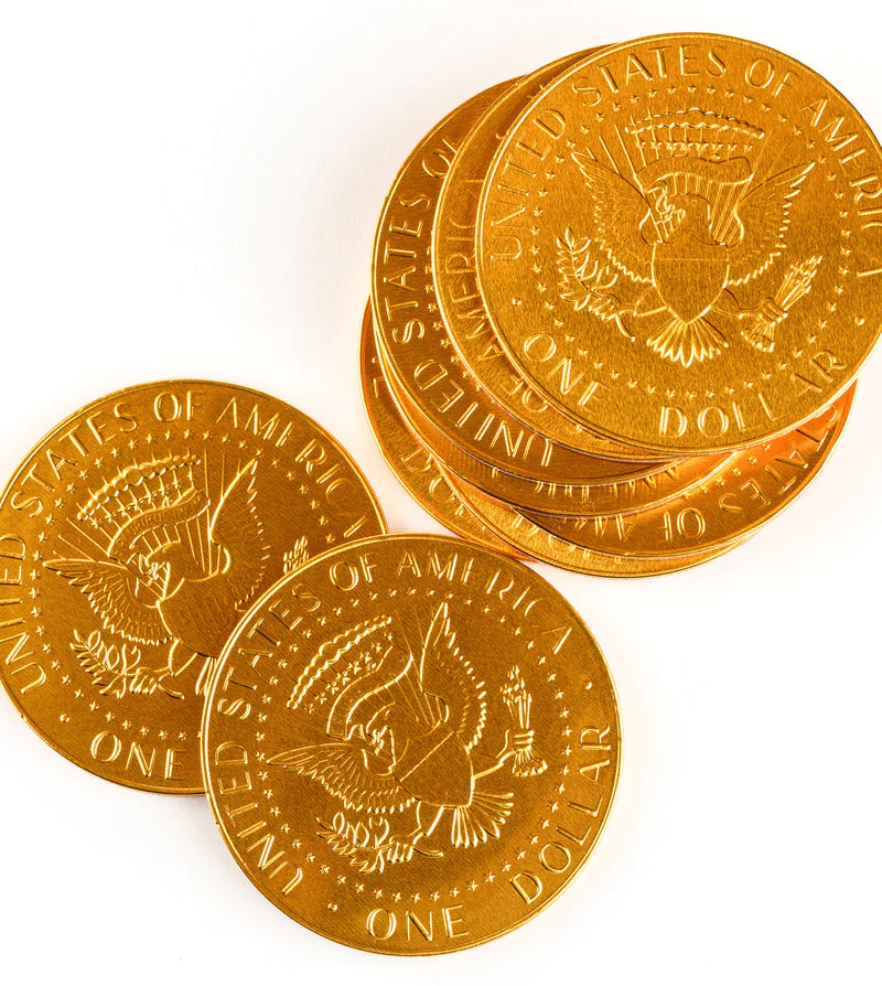 Gerrit's Fort Knox® Gold Coins are made of creamy milk chocolate and come in the classic gold coin shape we all know and love. The Penny Candy Store carries a variety of sizes, colors and configurations sure to make any theme party or event special! Enjoy over 0.8 ounces of solid premium milk chocolate that is 2.95 inches wide and embossed to look like a US dollar.