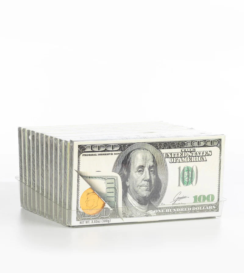 Here we have 20 Delicious Milk Chocolate Coins packed in a 100 bill themed box. Bix chocolate money value!