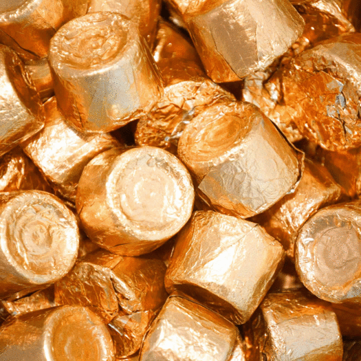 Milk chocolate with caramel candy individually wrapped in eye-catching Gold foils. Kosher and gluten-free caramels.