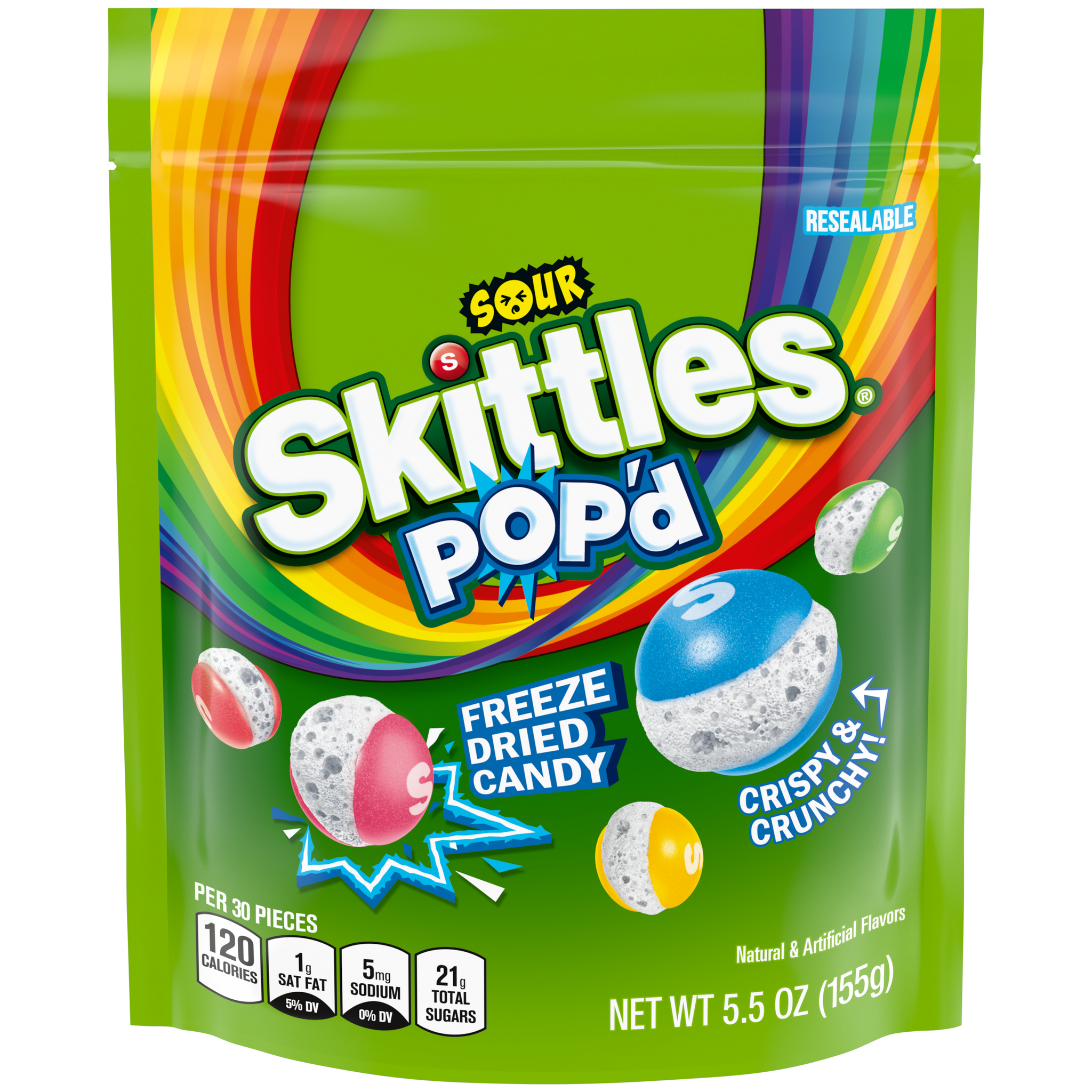 Introducing SKITTLES Sour POP'd Originals Freeze Dried Candy—a NEW favorite sour twist on your fave fruity candy! This resealable bag is perfect for a bite of tangy fruit flavor anytime you need it. Whether you're hitting the road, hosting a party, or just cozying up for movie night, SKITTLES Sour POP'd freeze dried candy bring a playful, crunchy twist to your snacking. Don't miss out on this exciting new way to enjoy SKITTLES; grab a bag today and experience the fun of fruity flavor with a crazy crunch. Pop open a bag and let the tangy taste adventure begin! Add to your cart today.